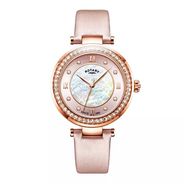 This beautiful Rotary watch includes a rose gold PVD case with a patterned mother of pearl inner dial and a pink outer dial. Set into the outer dial lies both applied and stone set indexes, which is then encompassed by a glittering stone set bezel. The watch is perfectly paired with a pink satin strap secured by a Rotary buckle.